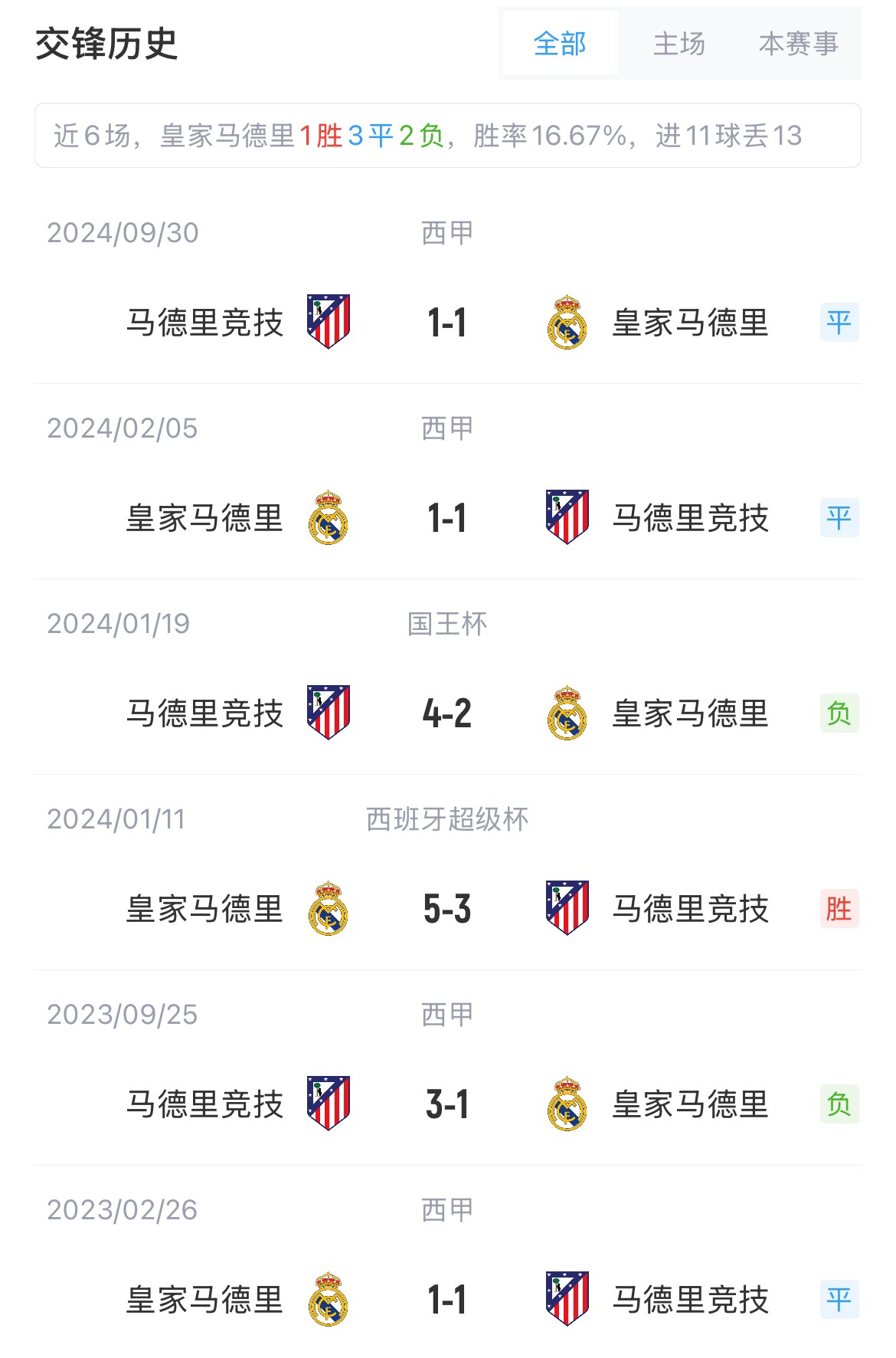 皇馬目前以49分排名西甲榜首,馬競(jìng)48分排在第二。賽季的首次交手中,皇馬客場(chǎng)1-1戰(zhàn)平馬競(jìng)。