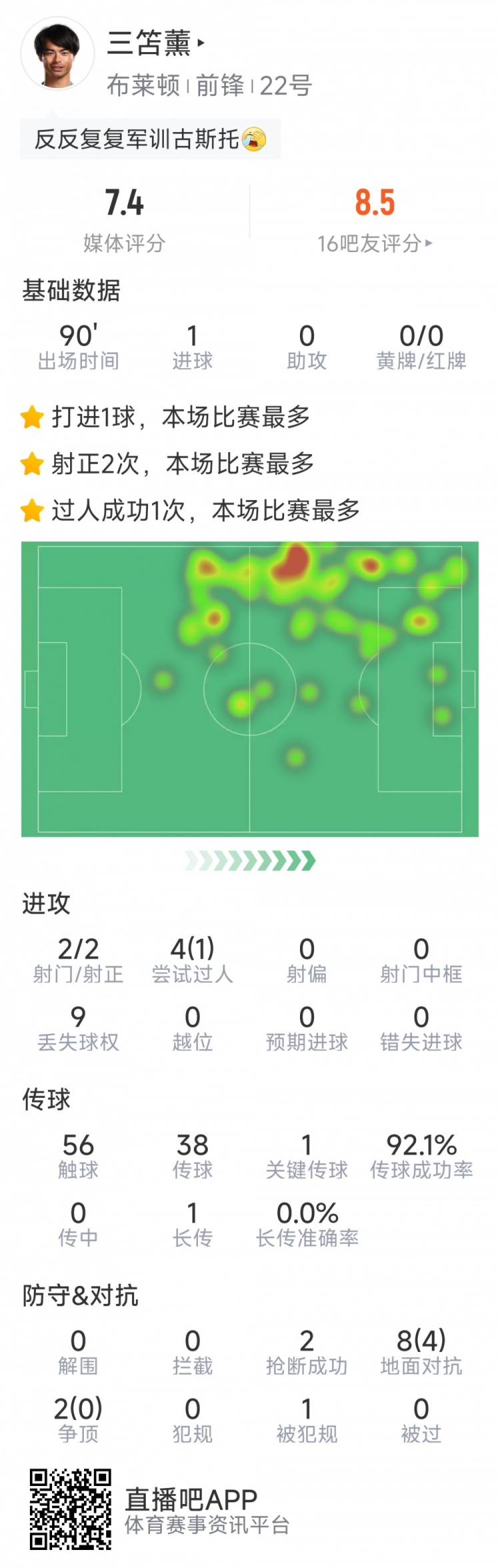 2月9日訊 在本輪足總杯,布萊頓2-1擊敗切爾西,三笘薫打進(jìn)一球,以下為他在本場數(shù)據(jù):比賽時間90分鐘1粒進(jìn)球2次射門均射正4次過人1次成功56次觸球1次關(guān)鍵傳球傳球成功率92.1%2次搶斷10次對抗4次成功sofa評分7.4分 本文標(biāo)簽: 足球 英超 布萊頓