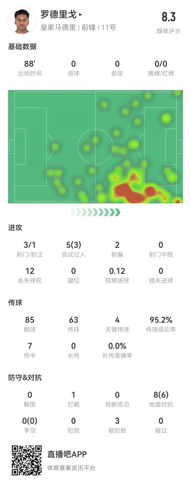 2月9日訊 皇馬在本輪西甲對(duì)陣馬競(jìng),羅德里戈本場(chǎng)數(shù)據(jù)如下: