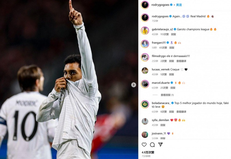 羅德里戈也在賽后通過社媒曬出自己的慶祝照,并配文:“又一次……???? 皇家馬德里????????????”。