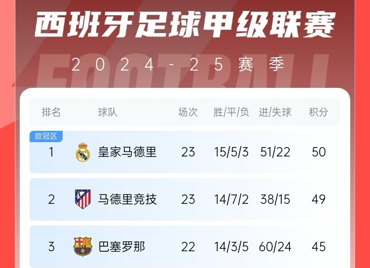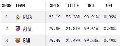 02月09日訊 西甲第23輪馬德里德比戰(zhàn)成1-1,這使得榜首三隊的爭冠形勢更具懸念。截至本文發(fā)出,數(shù)據(jù)機構(gòu)Opta的最新演算預(yù)測顯示,皇馬的西甲奪冠概率55.28%居首,其次是排名第三的巴薩有22.49%,馬競21.81%幾乎與巴薩平分秋色。機構(gòu)目前預(yù)測本賽季最終皇馬積分將達到83分,馬競和巴薩均為79分。 本文標簽: 足球 西甲 皇家馬德里 巴塞羅那 馬德里競技