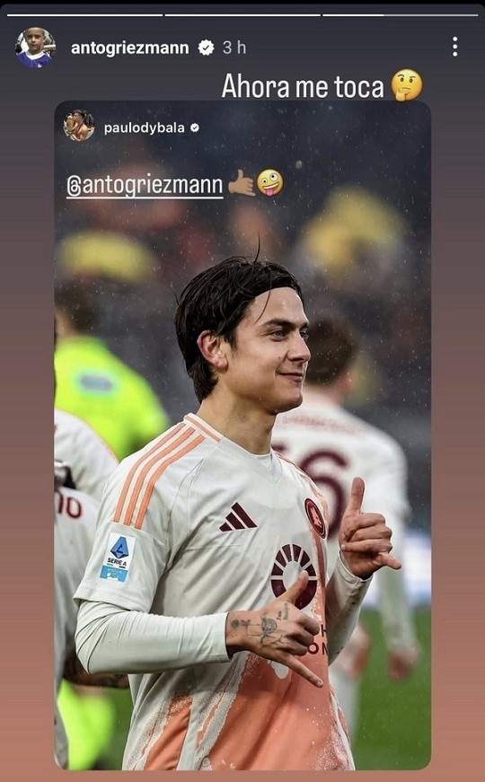 而格列茲曼隨即回應(yīng)稱:“現(xiàn)在輪到我了?!辈⑴渖狭艘粋€迪巴拉經(jīng)典的戴面具慶祝動作圖標(biāo)。媒體認為,格列茲曼可能會在下一次進球后模仿迪巴拉的慶祝動作。