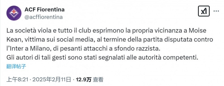 一些人在網(wǎng)上發(fā)布針對(duì)小基恩的種族主義內(nèi)容,對(duì)此佛羅倫薩官方發(fā)表聲明:“佛羅倫薩俱樂(lè)部對(duì)小基恩表示支持和慰問(wèn),客戰(zhàn)國(guó)米的比賽后他在社交媒體上遭到嚴(yán)重的種族主義攻擊。這些攻擊行為的實(shí)施者已經(jīng)被報(bào)告給相關(guān)當(dāng)局?!?/p>