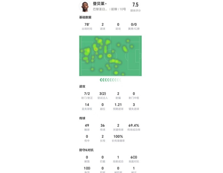 技術(shù)統(tǒng)計(jì)數(shù)據(jù)顯示,登貝萊本場比賽7射兩正,3次過人兩次成功,3次錯(cuò)失重大機(jī)會(huì)。另外,登貝萊有兩次關(guān)鍵傳球,兩次長傳全部成功。