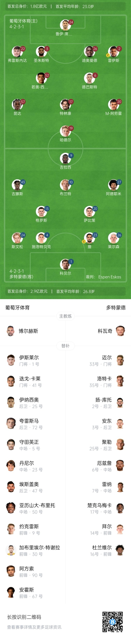 葡體首發(fā):24-魯伊-席爾瓦、2-雷斯、3-圣朱斯特、6-德巴斯特、17-特林康、19-哈德、20-馬克西米利亞諾-阿勞霍、22-弗雷斯內(nèi)達(dá)、26-迪奧曼德、52-西莫斯、57-昆達(dá)