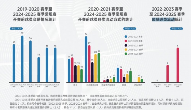 配簽約2人次。較前兩個賽季相比(2022-2023賽季、2023-2024賽季),自由球員認領、獨家簽約權轉(zhuǎn)讓及球員租借的數(shù)量有所增加,同時頂薪球員流動增加,共有4名頂薪球員通過獨家簽約權轉(zhuǎn)讓(2人)、轉(zhuǎn)會(1人)及自由球員認領(1人)的方式交易到新俱樂部并簽約頂薪。