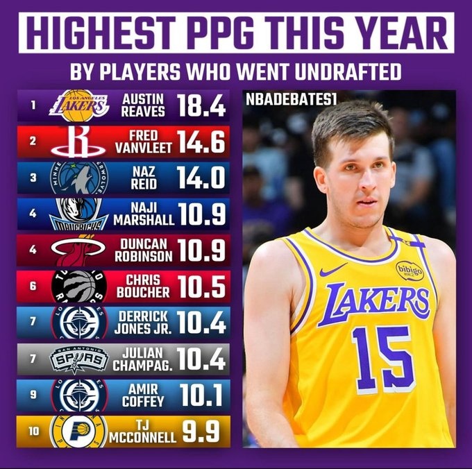 本賽季落選秀場均得分榜:里夫斯18.4分第1 范喬丹&里德排2、3位