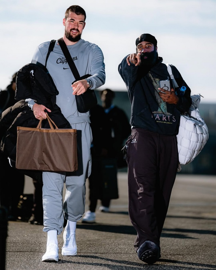 快船眾將登機(jī)??哈登神仙指路 萊昂納德衛(wèi)衣+外套裹得嚴(yán)實(shí)
