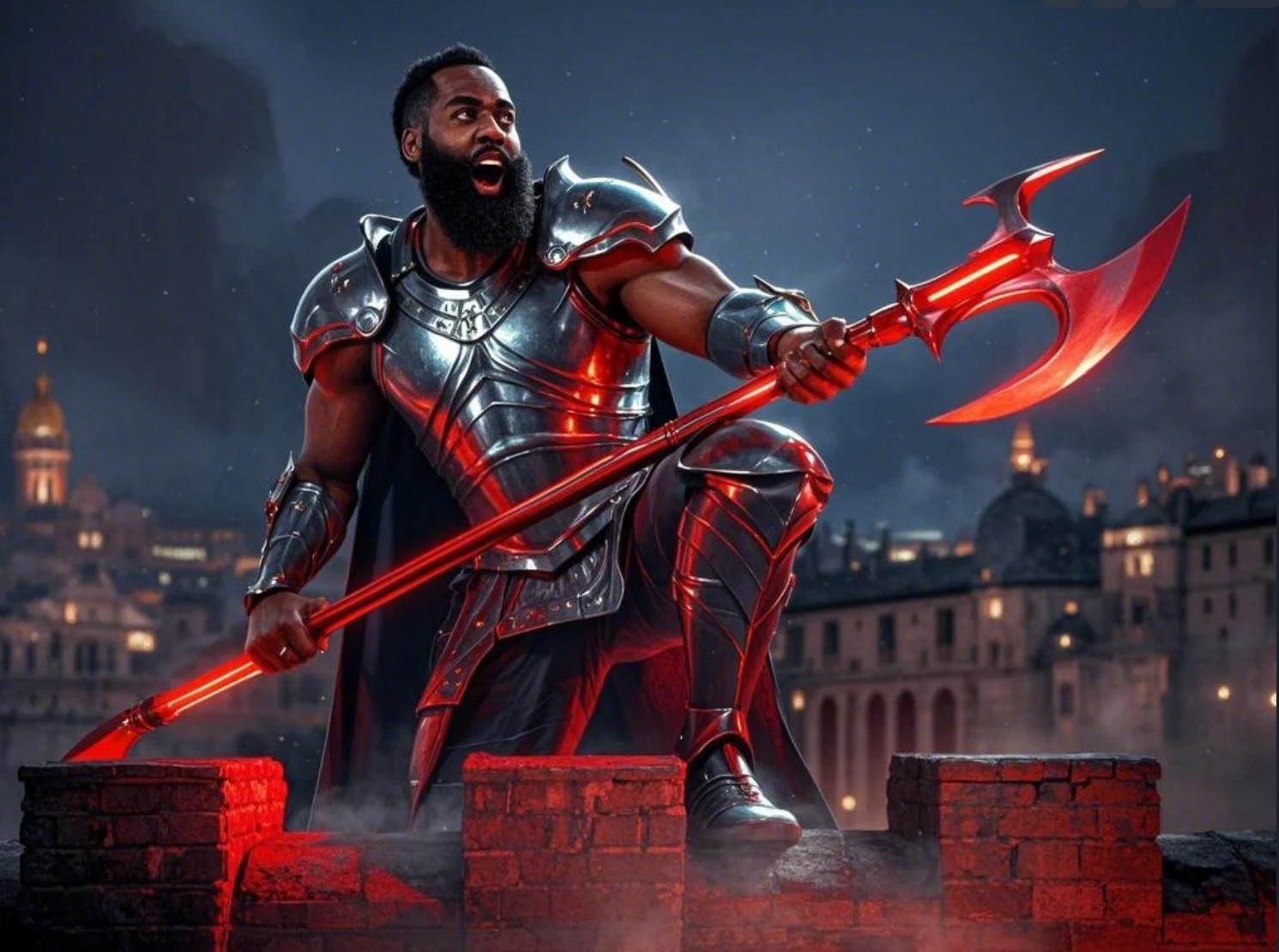【AI繪圖】50分!登哥身穿紅芒鎧甲手拿鉤戟站在城墻上怒吼