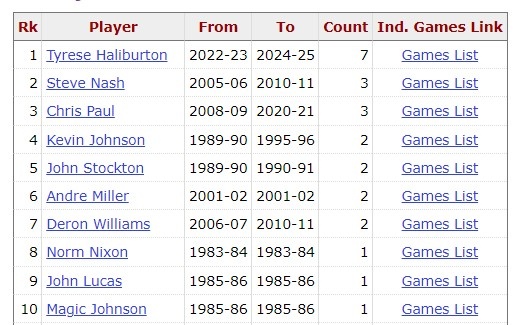 根據(jù)數(shù)據(jù)統(tǒng)計(jì),這是哈利伯頓生涯第8次打出單場(chǎng)至少20分15助并且0失誤的比賽,他在這一榜單上高居歷史第1。