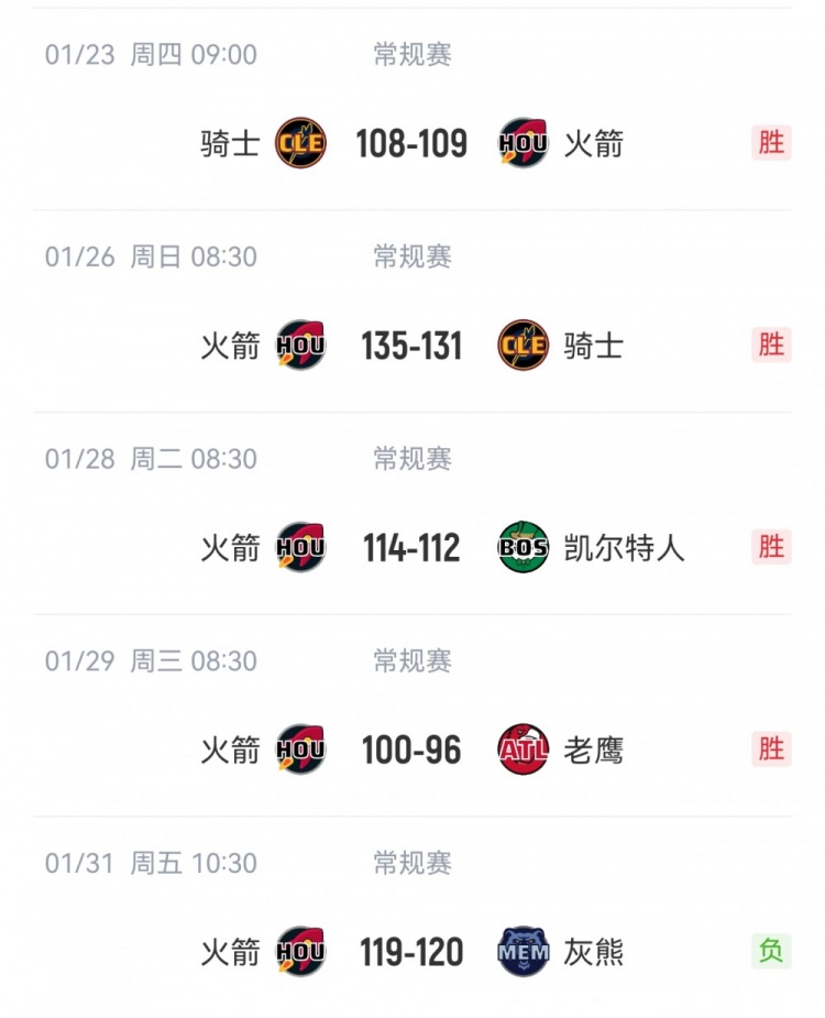 1月31日訊 NBA常規(guī)賽,火箭119-120不敵灰熊。在過(guò)去5場(chǎng)比賽中,火箭每場(chǎng)比賽分差都不超過(guò)4分,期間火箭4勝1負(fù)。 本文標(biāo)簽: 籃球 NBA 火箭