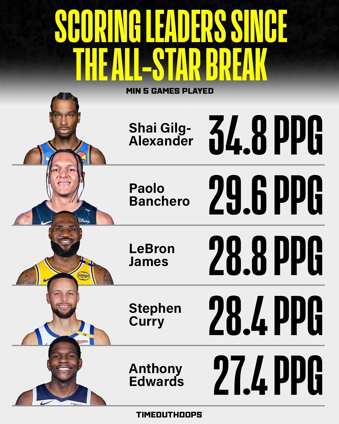 全明星后得分榜:鴨梨34.8分斷檔第一 班凱羅第二 詹庫分列三四位