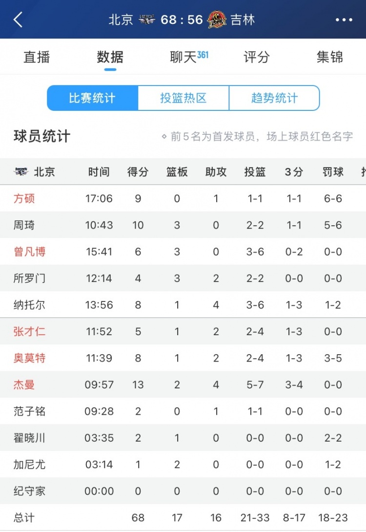 上半場(chǎng)比賽,北京進(jìn)攻端多點(diǎn)開花,出戰(zhàn)11人皆有得分入賬,除兩人上雙(杰曼13分、周琦10分)外,其他人都不同程度有得分。