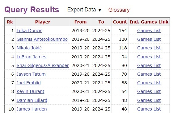 在2020年以來的30+5+5榜單上,東契奇目前以155場(chǎng)高居第一,字母哥120場(chǎng)第2,約基奇118場(chǎng)第3。