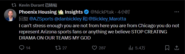 球迷一:我簡(jiǎn)直不能更強(qiáng)調(diào)這一點(diǎn),你不是本地人,你是芝加哥人,不能代表亞利桑那州的體育迷,也不能代表我們的任何想法。停止在我們的球隊(duì)制造鬧劇吧,老天?。?/p>