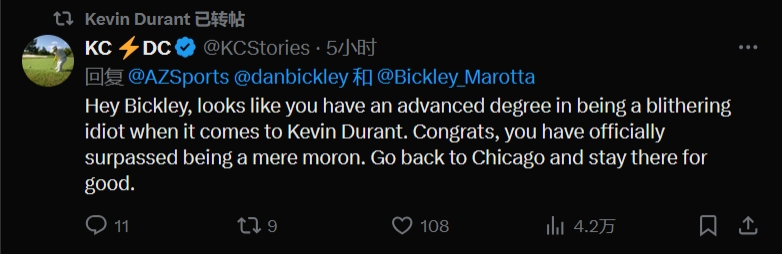 球迷三:嘿,看來(lái)你在"如何成為關(guān)于凱文-杜蘭特的胡說(shuō)八道專家"這方面已經(jīng)獲得了高等學(xué)位。恭喜你,你正式超越了一個(gè)普通的白癡????。趕緊滾回芝加哥,永遠(yuǎn)待在那兒吧。