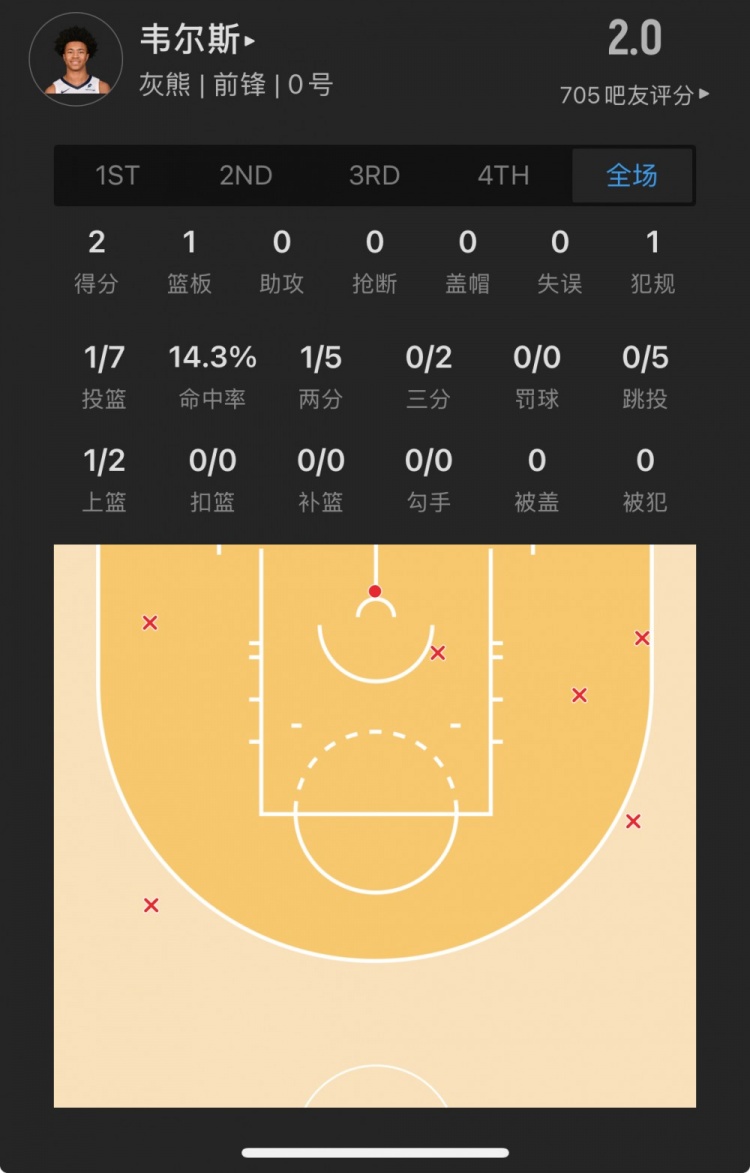 灰熊39號(hào)秀 杰倫-韋爾斯 登場(chǎng)20.9分鐘