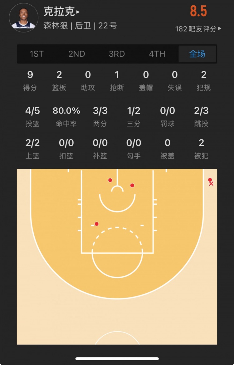 森林狼23年53號(hào)秀 杰倫-克拉克 登場(chǎng)11.8分鐘
