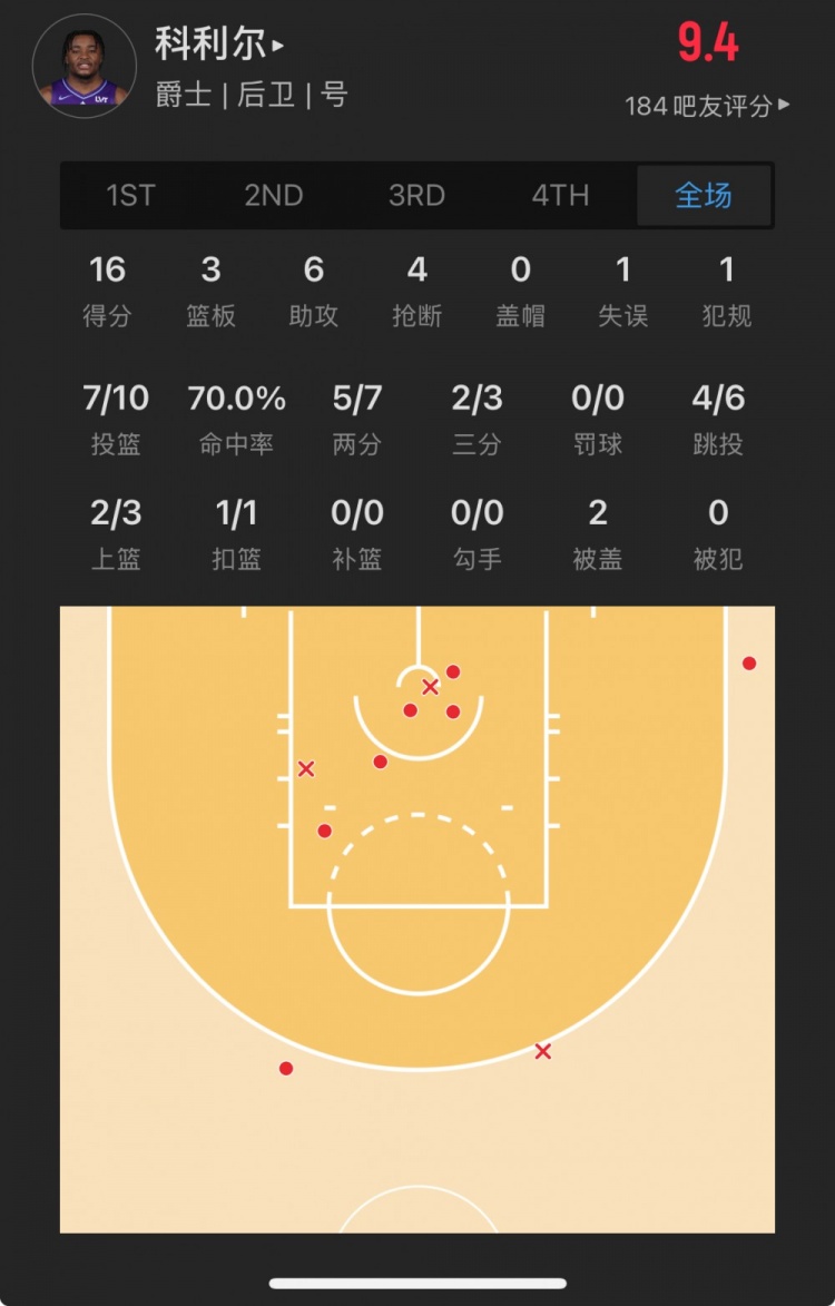 爵士29號(hào)秀 以賽亞-科利爾 登場(chǎng)27.7分鐘
