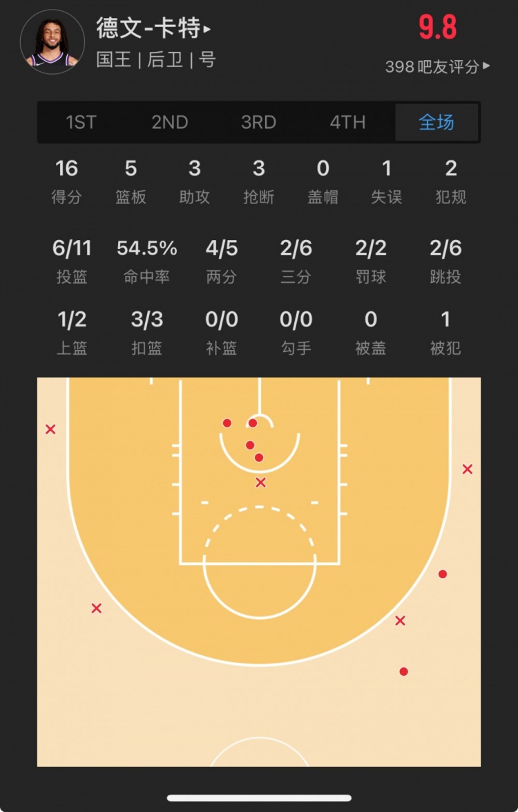 國(guó)王13號(hào)秀 德文-卡特 登場(chǎng)30.8分鐘