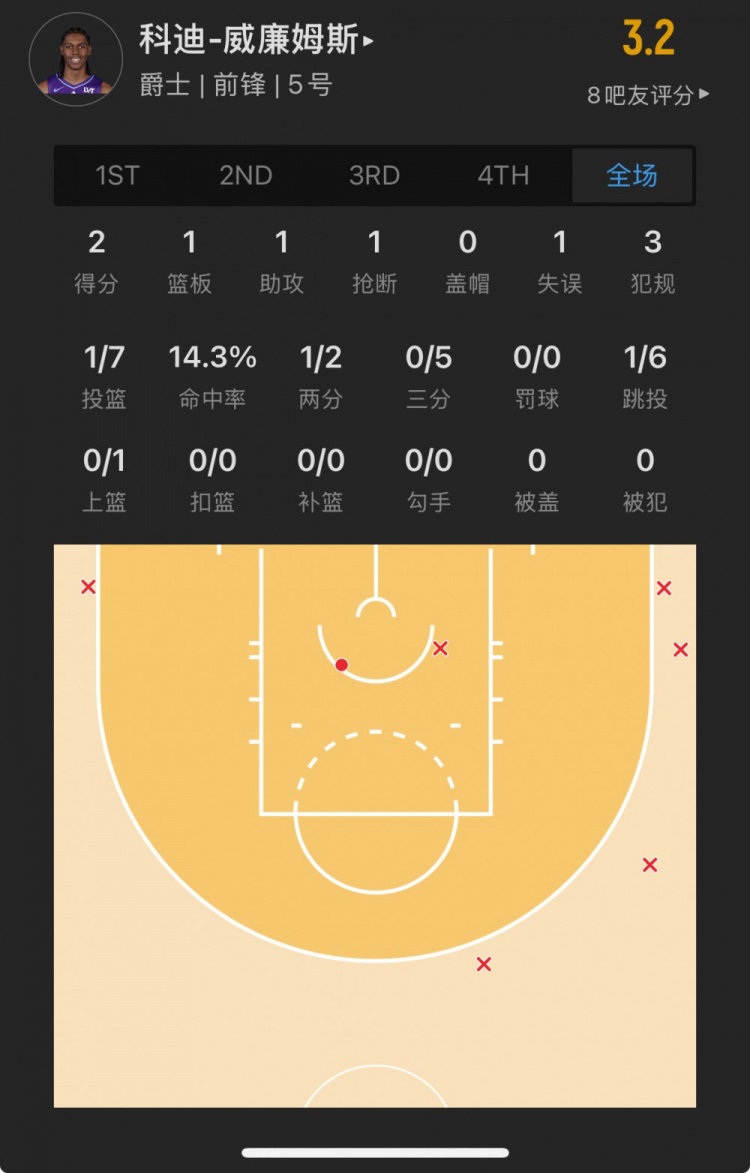 爵士10號(hào)秀 科迪-威廉姆斯 登場(chǎng)28.3分鐘