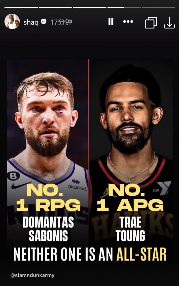 - 鳴不平?!奧尼爾轉(zhuǎn)發(fā):籃板王小薩和助攻王特雷-楊都無緣全明星