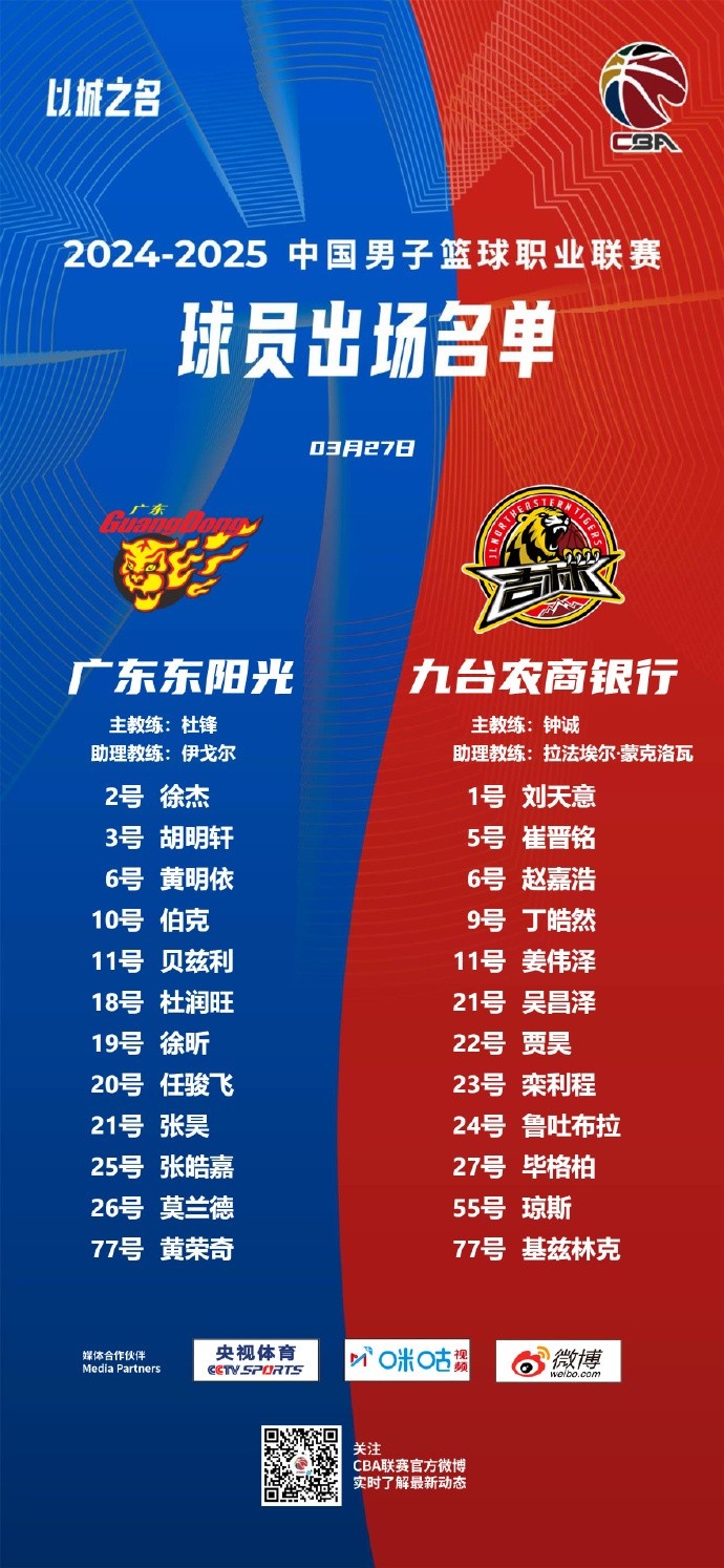 3月27日訊 今晚7點35分,廣東男籃將在主場迎戰(zhàn)吉林男籃。兩隊本場比賽的大名單已經出爐,具體為:廣東隊:徐杰、胡明軒、黃明依、伯克、貝茲利、杜潤旺、徐昕、任駿飛、張昊、張皓嘉、莫蘭德、黃榮奇。吉林隊:劉天意、崔晉銘、趙嘉浩、丁晧然、姜偉澤、吳昌澤、賈昊、欒利程、魯吐布拉、畢格柏、瓊斯、基茲林克。 本文標簽: 籃球 CBA 中國籃球 廣東 吉林