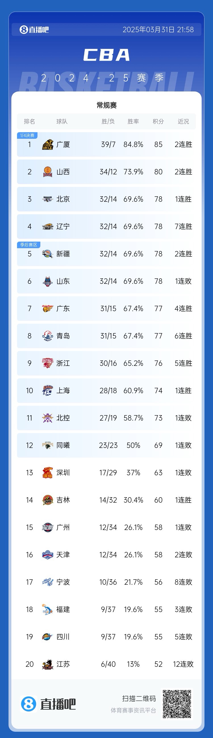 CBA常規(guī)賽今日迎來收官戰(zhàn),廣廈以39勝7負(fù)的戰(zhàn)績(jī)奪得榜首位置,北京和遼寧分列三四,廣東第七將戰(zhàn)上海,同曦排名十二首進(jìn)季后賽,江蘇6勝40負(fù)排在榜尾。 本文標(biāo)簽: 籃球 CBA 中國(guó)籃球 廣東 遼寧 浙江 廣廈 新疆 北京 上海 山東 深圳 山西 廣州 江蘇 同曦 福建 吉林 天津 青島 四川 北控 寧波