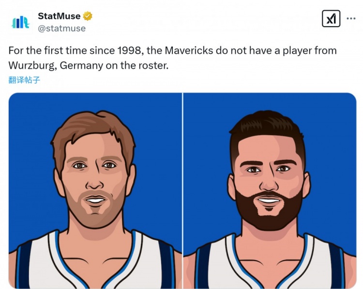 美媒StatMuse:“這是1998年以來(lái),獨(dú)行俠首次隊(duì)里沒(méi)有一名來(lái)自德國(guó)維爾茲堡的球員。(諾維茨基和克萊伯均來(lái)自此地)”