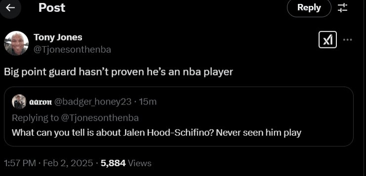 記者Tony Jones回復道:“高大的控球后衛(wèi)(198cm)還未能證明自己具備NBA球員的實力。”