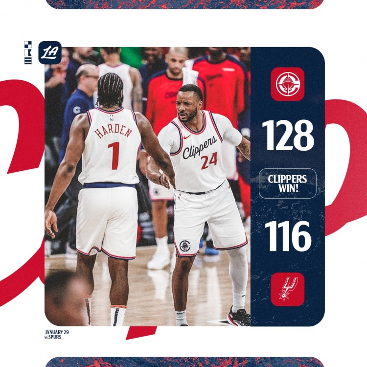 1月30日訊 NBA常規(guī)賽,快船128-116戰(zhàn)勝馬刺。賽后快船官方贏球海報中,哈登和鮑威爾登上封面。本場比賽,哈登在37分鐘的時間里,投籃15中7,三分球5中3,罰球7中4,拿到21分3籃板12助攻3搶斷1蓋帽的數(shù)據(jù);鮑威爾穩(wěn)定發(fā)揮,打了37分鐘15投9中,三分6中3、罰球6中6拿到27分8籃板1助攻,正負值+18。 本文標簽: 籃球 NBA 快船 哈登