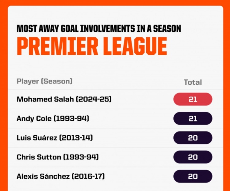 2月12日訊 Opta統(tǒng)計了球員單賽季在英超客場比賽中參與進(jìn)球的數(shù)量,并列出榜單,本賽季薩拉赫參與21球(13球8助),與科爾并列排名首位。單賽季英超客場參與進(jìn)球榜:薩拉赫(2024-2025)——21安迪-科爾(1993-1994)——21蘇亞雷斯(2013-2014)——20薩頓(1993-1994)——20桑切斯(2016-2017)——20 本文標(biāo)簽: 足球 英超 利物浦 薩拉赫