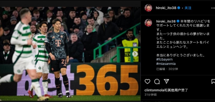 2月13日訊 歐冠淘汰賽附加賽首回合,拜仁客場2-1擊敗凱爾特人,取得晉級先機。比賽第78分鐘,傷缺半年的伊藤洋輝替補登場,上演拜仁首秀。賽后伊藤洋輝在社媒發(fā)文,他寫道:“感謝這半年間幫助我進行康復(fù)的各位。自己小時候的又一個夢想實現(xiàn)了,這是自己拜仁生涯的新的開始。真的,非常感謝各位的幫助與支持?!?/p> 本文標簽: 足球 歐冠 德甲 拜仁慕尼黑 五洲 J聯(lián)賽 蘇超
