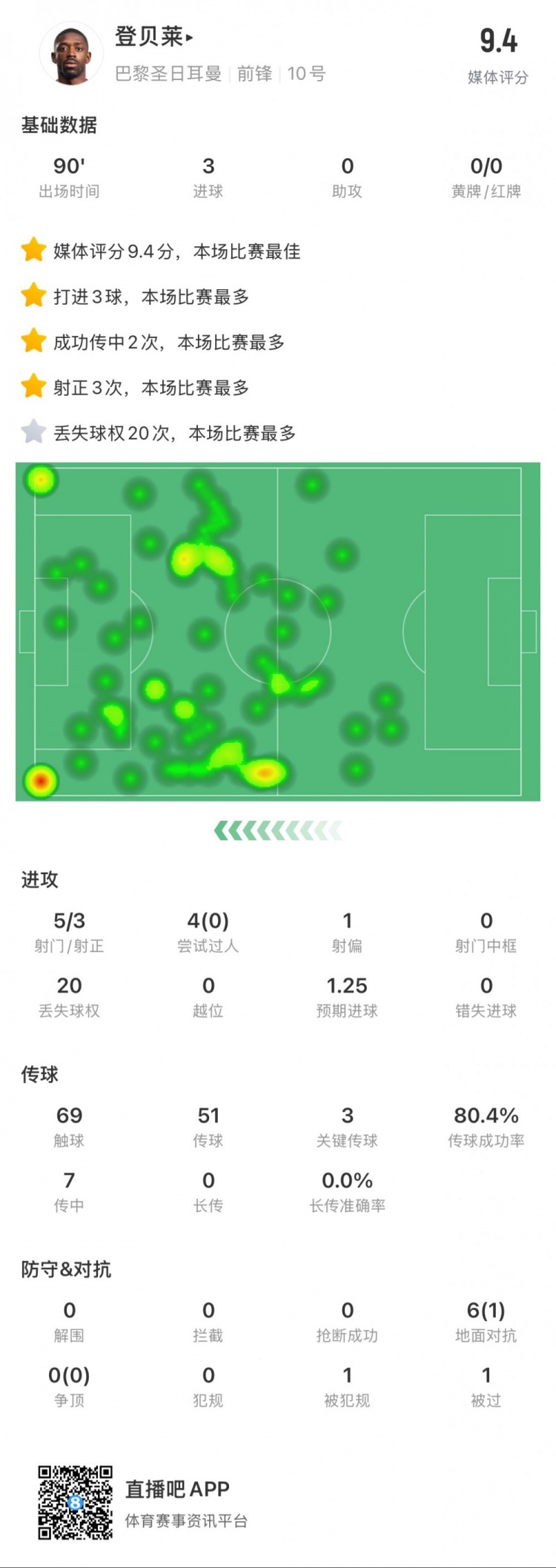 1月30日訊 歐冠最后1輪比賽,巴黎4-0斯圖加特,登貝萊上演帽子戲法。登貝萊全場(chǎng)數(shù)據(jù):打進(jìn)3球5次射門3次射正4次過人0次成功69次觸球51次傳球41次成功3次關(guān)鍵傳球7次傳中2次成功6次地面對(duì)抗贏得1次1次被犯規(guī) 本文標(biāo)簽: 足球 法甲 巴黎圣日耳曼 歐冠