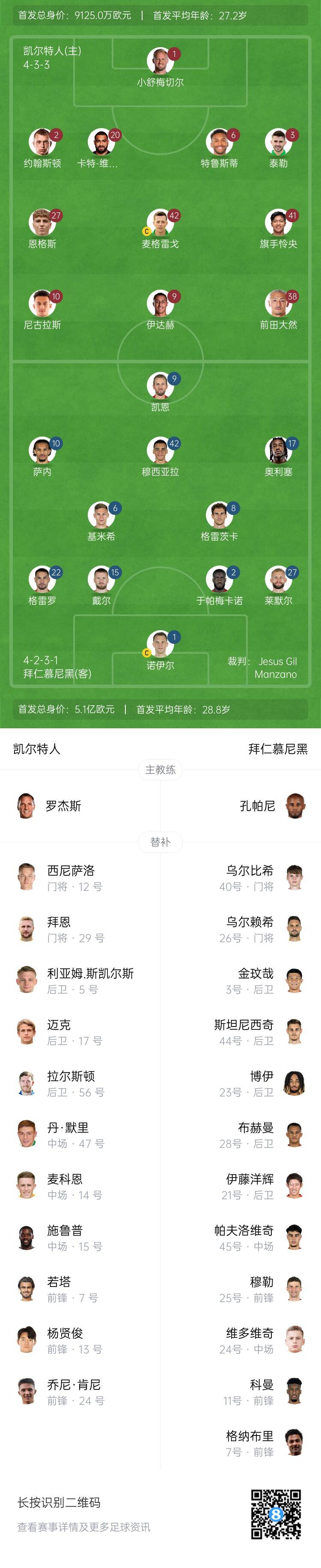 拜仁替補:26-烏爾賴希、40-烏爾比希、3-金玟哉、7-格納布里、11-科曼、21-伊藤洋輝、23-博伊、24-維多維奇、25-托馬斯-穆勒、28-布赫曼、44-斯坦尼西奇、45-帕夫洛維奇