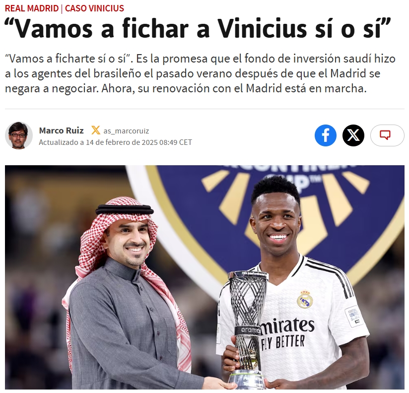 據(jù)悉,沙特方面的報(bào)價(jià)仍未正式發(fā)出,目前唯一擺在臺(tái)面上的就是他們的承諾,沙特人表示他們會(huì)在今夏為維尼修斯向開(kāi)出一份約3億歐元的巨額報(bào)價(jià),并且堅(jiān)稱“無(wú)論如何我們會(huì)簽下他”(“Le ficharemos sí o sí”)。