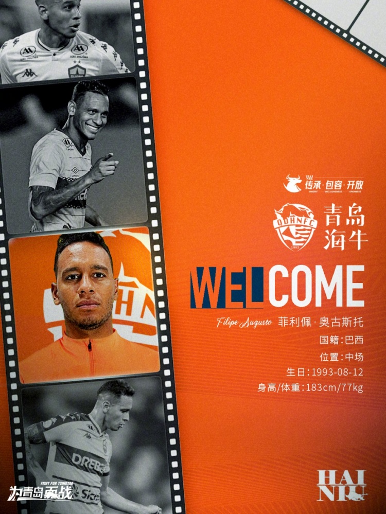 經友好協(xié)商并達成一致,自即日起菲利佩·奧古斯托(Filipe Augusto)自由身加盟青島海牛足球俱樂部。菲利佩·奧古斯托與俱樂部簽署1+1合同,歡迎他的到來。