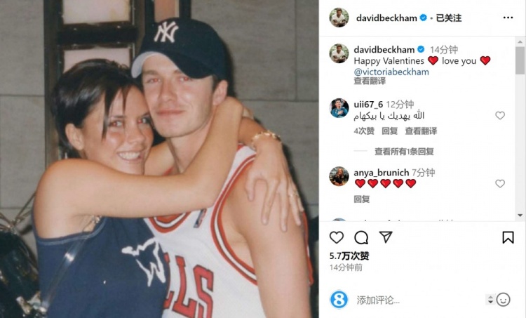 2月14日訊 貝克漢姆更新社媒動態(tài),慶祝情人節(jié)。貝克漢姆社媒曬出與妻子維多利亞昔日的合照,配文:“情人節(jié)快樂??愛你??維多利亞。”貝克漢姆與維多利亞1997年相識,兩人在1999年舉辦婚禮,育有三子一女。 本文標(biāo)簽: 足球 英超 曼聯(lián) 邁阿密國際