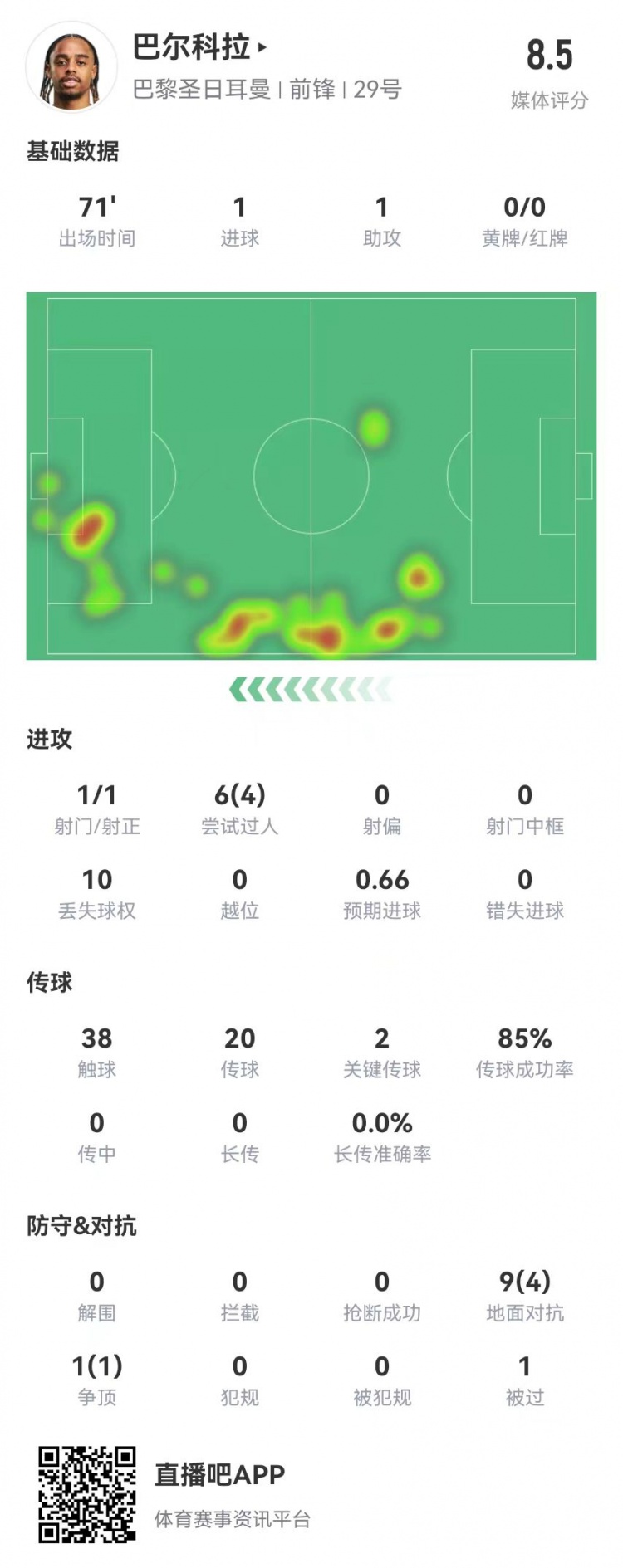 1月30日訊 巴黎在本輪歐冠4-1領(lǐng)先斯圖加特,巴爾科拉本場數(shù)據(jù)如下: