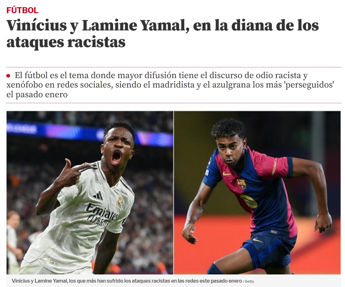 根據(jù)西班牙相關(guān)當(dāng)局最新報(bào)告顯示,足球領(lǐng)域已成為西班牙社交媒體上種族主義和仇外仇恨言論滋生最嚴(yán)重、傳播最廣泛的領(lǐng)域?;蜀R球星維尼修斯和巴薩新星亞馬爾成為主要被攻擊目標(biāo),這些充滿攻擊性的言論試圖通過(guò)"非人化"受害者來(lái)達(dá)到攻擊目的。