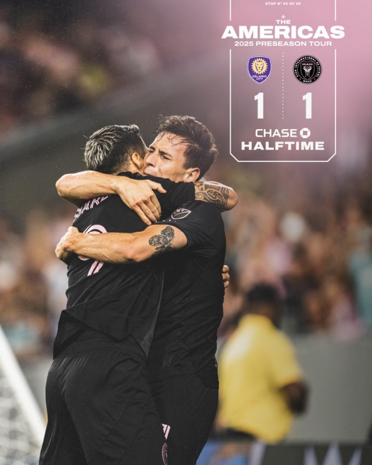 傷停補(bǔ)時(shí)1分鐘。上半場(chǎng)比賽結(jié)束,邁阿密國(guó)際1-1奧蘭多城。