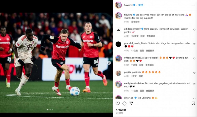 2月16日訊 勒沃庫森在本輪德甲焦點戰(zhàn)0-0被拜仁逼平,積分榜上仍然落后8分。維爾茨最后時刻錯失絕殺。維爾茨也在賽后通過社媒曬出自己的比賽照,并配文:“我們配得上更多!但我仍然為全隊感到驕傲!感謝(主場球迷的)大力支持!” 本文標簽: 足球 德甲 拜仁慕尼黑 勒沃庫森