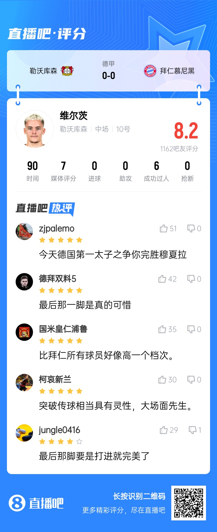 維爾茨在凌晨的比賽中6次成功過人,給拜仁的后防線帶來了很大壓力,但也在比賽最后時刻錯失了絕殺良機。