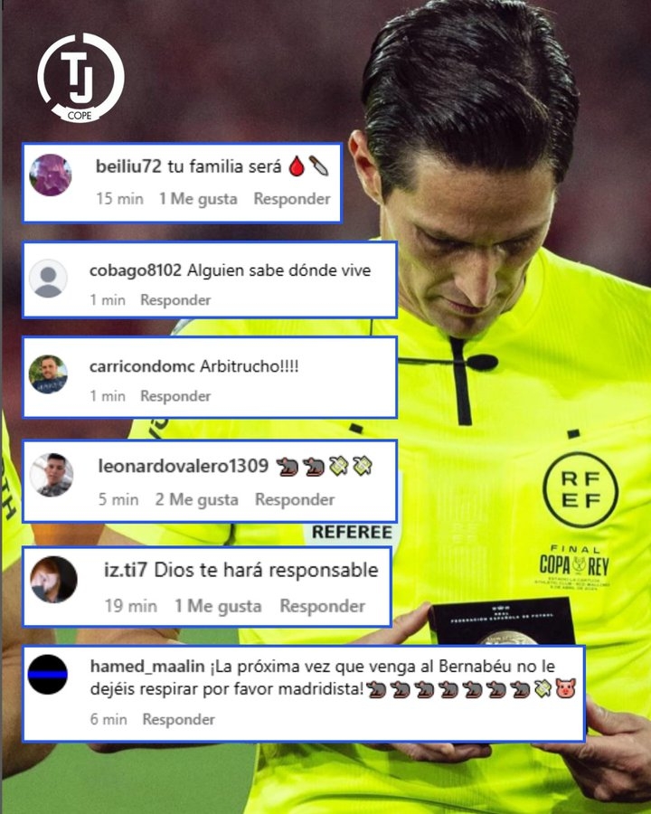 其中不乏極其惡劣的死亡恐嚇,包括“我要?dú)⒘四恪?、“你該?dān)心孩子們的安?!薄ⅰ敖诸^遇見(jiàn)必讓你拄拐”以及“下次來(lái)伯納烏別想呼吸,皇馬球迷們請(qǐng)堵死他”等言論。