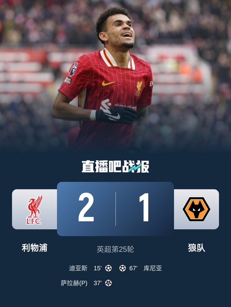 英超第25輪,利物浦2-1戰(zhàn)勝狼隊,迪亞斯破門、薩拉赫點射。