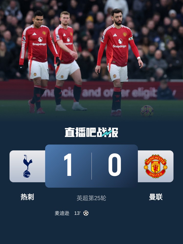 英超第25輪,熱刺主場1-0曼聯(lián),麥迪遜制勝,加納喬失良機。