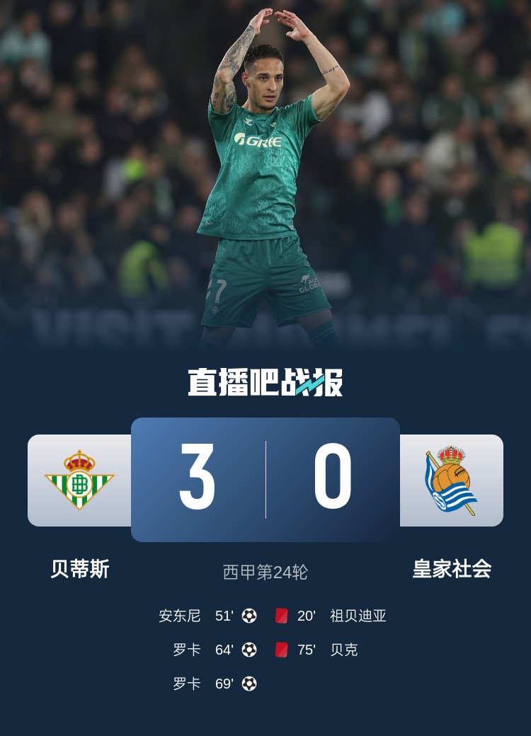 西甲第24輪,貝蒂斯3-0皇家社會,安東尼世界波,羅卡梅開二度。
