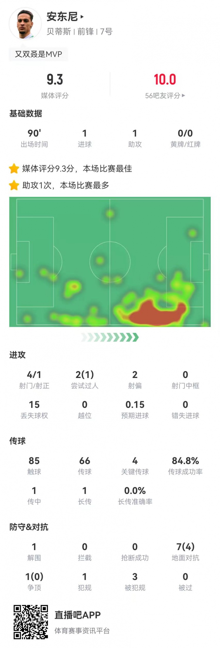 2月17日訊 貝蒂斯在本輪西甲3-0完勝皇社,安東尼本場數(shù)據(jù)如下:首發(fā)踢滿全場1球預期進球0.151助攻預期助攻0.1385觸球66傳球、56成功,成功率85%4關鍵傳球1傳中、0成功1長傳、0成功4射門、1射正2過人、1成功1造點8對抗、4成功15丟失球權1犯規(guī)3造犯規(guī)1解圍獲評9.3分全場最高 本文標簽: 足球 英超 曼聯(lián) 西甲 貝蒂斯 皇家社會