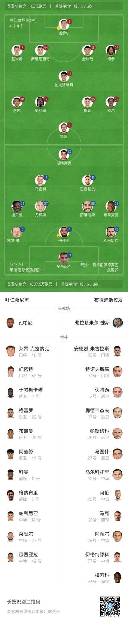 拜仁替補:35-施密特、48-卡拉尼克、2-于帕梅卡諾、7-格納布里、11-科曼、16-帕利尼亞、22-格雷羅、27-萊默爾、28-鮑曼、42-穆西亞拉、49-阿茲努
