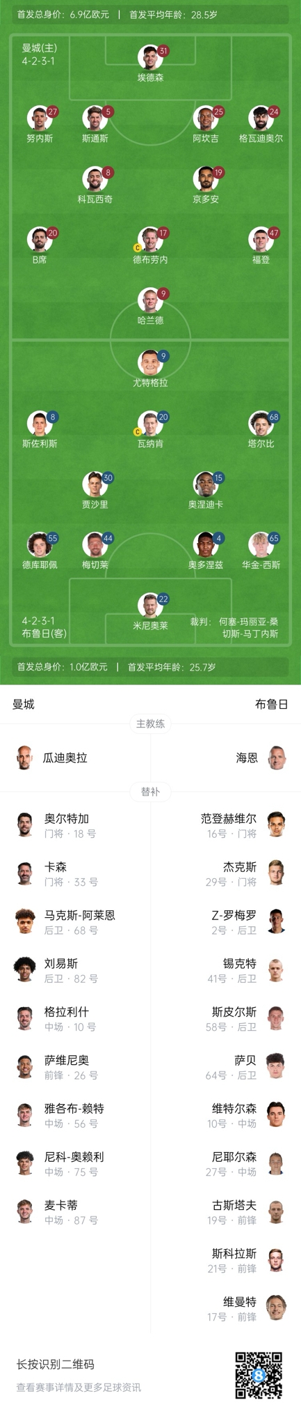 曼城首發(fā):31-埃德森、5-斯通斯、25-阿坎吉、24-格瓦迪奧爾、27-努內(nèi)斯、8-科瓦西奇、17-德布勞內(nèi)、19-京多安、20-B席、47-福登、9-哈蘭德